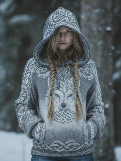 Retro Viking Wolf Celtic Knot Tree Of Life Gradient Print Hooded Sweatshirt